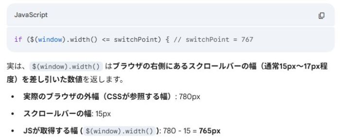 スクロールバーの有無による判定のズレなんて。スクロールバーの幅なんて、考えてもいませんでした。